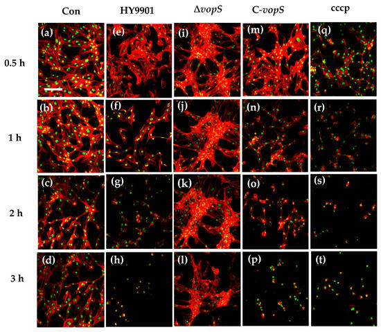 Laser scanning confocal microscopy infection observation (100 µm). V. alginolyticus infection of CIK cells induces nuclear condensation and fragmentation in a T3SS-dependent manner. CIK cells were infected with strain HY9901 (e–h), ΔvopS (i–l), or C-vopS (m–p) as described. Cells were treated with 2 μM STS as a positive control (q–t) or left uninfected(a–d) for the negative control. Nuclear condensation and fragmentation were visualized using Hoechst 33258 to stain nuclei at indicated time points after infection.