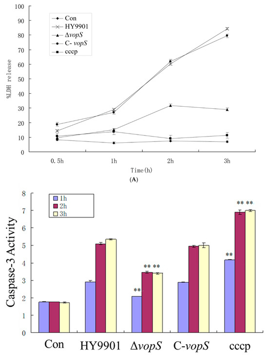 Our previous results showed that vopS was the essential gene to regulate V. alginolyticus virulence. We then visualized the nuclear morphology using Hoechst staining in order to further describe the process of cell death caused by the T3SS of V. alginolyticus. Nuclear condensation was observed in some HY9901 and C-vopS-infected cells at 30 min post-infection (Figure 4e,m). As the infection time extended, increasing amounts of cells showed apoptotic characteristics, including nucleus fragmentation and formation of apoptotic body, which could be seen by fluorescence microscope (Figure 4f–h,n–p). This phenotype resembled that seen in carbony1 cyanide 3-chlorophenyl 1 hydrazone (CCCP), a strong inducer of apoptosis (Figure 4q–t). Conversely, the nuclear compartments in ΔvopS-infection cells remained intact during infection, which was roughly in line with the uninfected cells’ appearance (Figure 4i–l,a–d). An LDH release assay was conducted to further assess the cytotoxicity of ΔvopS. As early as 30 min after infection with the HY9901 and C-vopS, we noticed a notable release of LDH into the medium. LDH concentrations in the medium rose in tandem with the infection duration, reaching over 80% total LDH release 3 h after infection (Figure 5A). Nevertheless, there was no discernible difference in the levels of LDH between the medium of ΔvopS-infected and uninfected cells (Figure 5A).