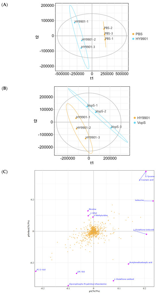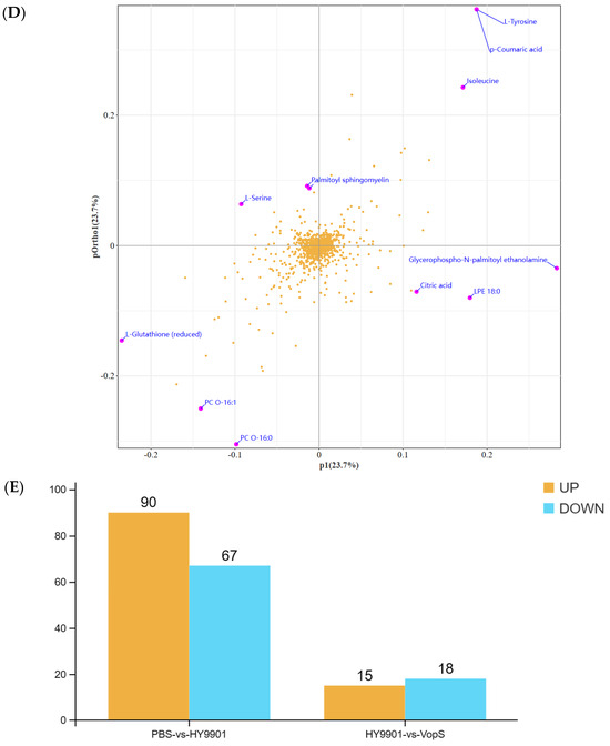 Bacterial virulence factors can be delivered to host cells to hijack cellular metabolism. To study the metabolomic responses of the CIK cell line to the infection of V. alginolyticus, untargeted metabolomics analysis was used to profile metabolite changes in the HY9901-infected cells, ΔvopS-infected cells, and non-infected cells. In the three group cells, 2250 metabolites were identified (Table S1). Partial least-squares discrimination analysis (PLS-DA) revealed that the metabolites in the three groups of cells clustered separately with no marked differences within groups (Figure 6A,B). Next, we used orthogonal partial least-squares discrimination analysis (OPLS-DA) to further screen for metabolites related to infection. Based on a correlation p ≥ 0.5 as a cutoff and an absolute covariance p ≥ 0.05, two S-plots (Figure 6C,D) were constructed and used to identify key metabolites or biomarkers in the three groups. When HY9901-infected cells and non-infected cells were compared, 157 differential metabolites were identified, with 90 upregulated and 67 downregulated (Figure 6E).