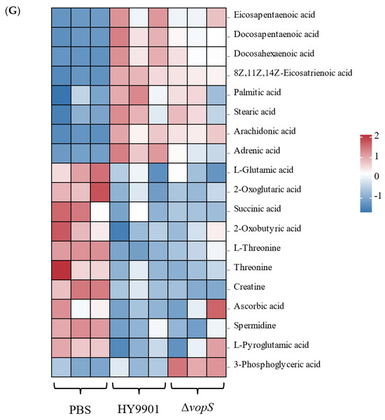 (A) Principal component analysis (PCA) of HY9901-infected group and non-infected group based on Bray–Curtis distance. (B) Principal component analysis (PCA) of HY9901-infected group and VopS-infected group based on Bray–Curtis distance. (C) S-plot generated from OPLS-DA for HY9901-infected group vs. non-infected group. (D) S-plot generated from OPLS-DA for HY9901-infected group vs. VopS-infected group. (E) Differential metabolites in PBS vs. HY9901 and HY9901 vs. VopS (p < 0.05, VIP ≥ 1). (F) KEGG showed 30 significantly (p < 0.05) enriched biological pathways associated with V. alginolyticus infection. (G) Significantly expressed metabolite categories related to V. alginolyticus infection and analyzed by heatmap. (H) Fold changes in biosynthesis of unsaturated fatty acids, TCA cycle, ferroptosis, glycine, serine, threonine, glycine, and glutathione metabolism for V. alginolyticus infection.