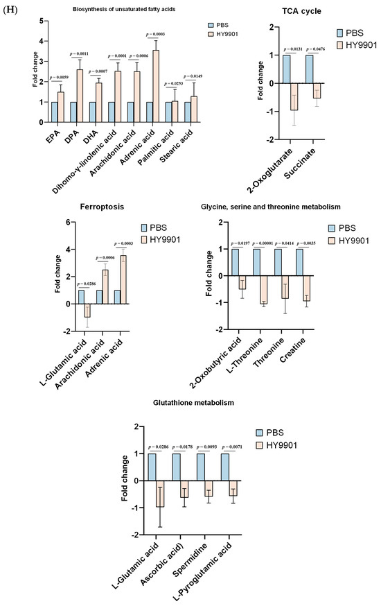 Following KEGG enrichment results, we identified significant accumulations of biosynthesis of unsaturated fatty acids intermediates, including icosapentaenoic acid (EPA), docosapentaenoic acid (DPA), docosahexaenoic acid (DHA), dihomo-γ-linolenic acid, arachidonic acid, adrenic acid, palmitic acid, and stearic acid (Figure 6G,H). The levels of some tricarboxylic acid (TCA) cycle intermediates, including 2-oxoglutarate and succinate, were significantly decreased (Figure 6G,H). Notably, the levels of the tested ferroptosis intermediate L-glutamic acid were significantly decreased, while arachidonic acid and adrenic acid were significantly increased (Figure 6G,H). The levels of glycine, serine, and threonine metabolism and its downstream metabolites, glycine and glutathione (GSH), were significantly decreased in HY9901-infected cells (Figure 6G,H). Together, the metabolomics data indicate that V. alginolyticus infection enhances the biosynthesis of unsaturated fatty acids and ferroptosis, while reducing glycine, serine, and threonine metabolism and downstream metabolism of serine in infected CIK cells.
