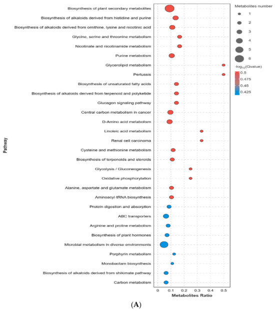 To perform peak alignment, peak selection, and quantification for every metabolite, Compound Discoverer 3.1 (CD3.1, Thermo Fisher, Waltham, MA, USA) was used to process the raw data files produced by UHPLC–MS/MS (Thermo Fisher, USA). The molecular formula was predicted using the normalized data based on fragment ions, additive ions, and molecular ion peaks. Peaks were then compared to the mzCloud (https://www.mzcloud.org/, accessed on 11 January 2023), mz Vault, and Mass List databases in order to acquire exact qualitative and relative quantitative results. The statistical software R (version R-3.4.3), Python (version 2.7.6), and CentOS (version 6.6) were used to conduct the statistical studies.