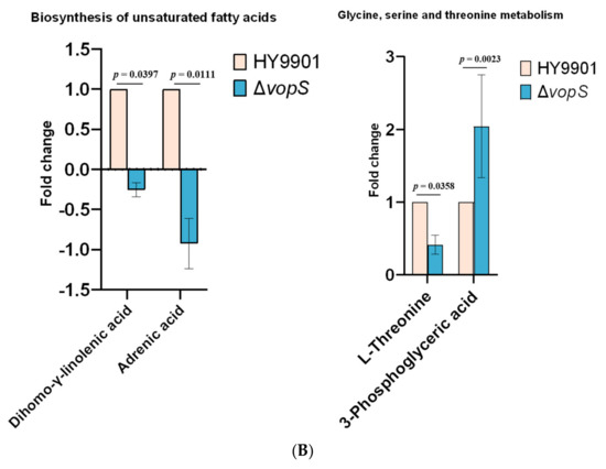 (A) KEGG showed 30 significantly (p < 0.05) enriched biological pathways associated with ΔvopS infection. (B) Fold changes in biosynthesis of unsaturated fatty acids and glycine, serine, and threonine metabolism for ΔvopS infection.