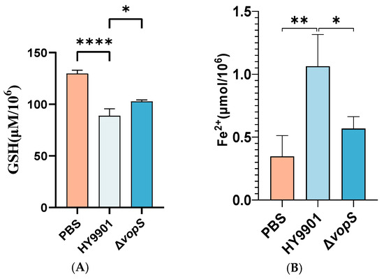 Our previous studies have demonstrated that VopS promoted the accumulation of unsaturated fatty acids, especially the accumulation of adrenic acid. Adrenic acid was reported as a marker of ferroptotic cell death [26]. To confirm that VopS is involved in the induction of ferroptosis cell death, we detected the level of GSH and ferrous (Fe2+) in the infected cell. As shown in Figure 8A, V. alginolyticus HY9901 infection led to a remarkable depletion of GSH compared with the control group. Deletion of the vopS gene could ameliorate the V. alginolyticus-induced decrease in total GSH. We also found that the Fe2+ iron levels elevated after V. alginolyticus infection, and Fe2+ accumulation of ΔvopS-infected cells was strongly reduced compared to HY9901-infected cells (Figure 8B). Therefore, these results indicated that VopS could induce ferroptosis in CIK cells.