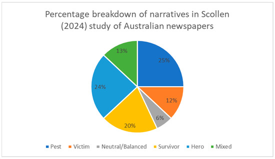 Percentage distribution of narratives in Scollen’s study about the ibis in Australian newspapers from 2013 to 2024.