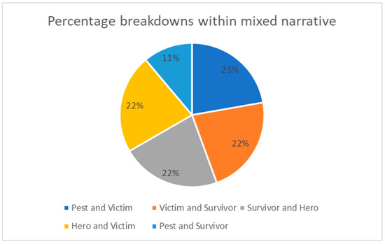 Of the 68 newspaper articles, nine (or 13% of the total sample) were identified as including a mixed narrative. This means they contained words and messages that presented more than one narrative (either pest, victim, survivor, or hero). Figure 2 (below) illustrates the distribution of mixed narratives within the nine newspaper articles. There were only two narratives present in any one article. The only combination of narratives not identified was pest and hero. Perhaps as these categories are positioned at each end of the narrative spectrum, a combination of the two in one article would seem incongruous with the story told.