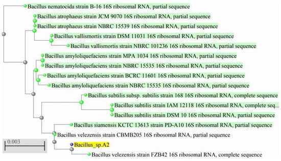 Phylogenetic tree based on 16S rDNA sequence comparisons of Bacillus sp. A2.
