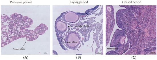 During the pre-laying period, the surface of the ovary in Wanxi White Geese displayed numerous primary follicles. In the laying period, the surface showed a large number of secondary follicles, while during the ceased-laying period, the surface exhibited inwardly concave and atretic follicles (Figure 1).