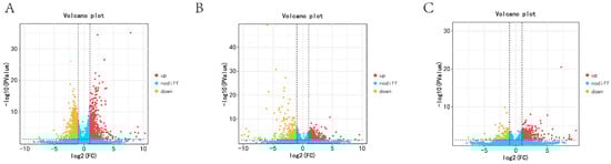 The DEGs in ovary tissues of Wanxi White Geese in different periods: (A) KL vs. CL; (B) CL vs. XL; (C) KL vs. XL.