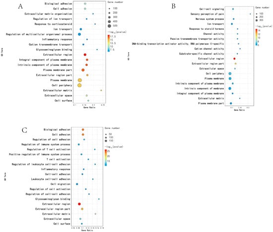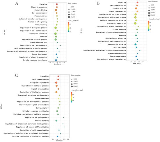 Functional analysis of DEGs GO in different periods: (A) KL vs. CL; (B) CL vs. XL; (C) KL vs. XL.