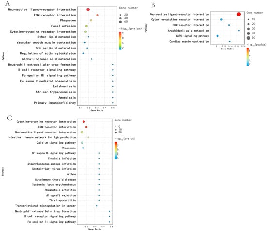 KEGG analysis was performed on DEGs across different breeding periods. Comparison between KL and CL revealed significant enrichment (p < 0.05) in 18 pathways, including Cytokine–cytokine receptor interaction, Sphingolipid metabolism, Neuroactive ligand–receptor interaction, and ECM receptor interaction. In the comparison between CL and XL, DEGs were significantly enriched in six pathways (p < 0.05), including Cytokine–cytokine receptor interaction, Calcium signaling pathway, ECM–receptor interaction, and Neuroactive ligand–receptor interaction. Moreover, DEGs were significantly enriched in 37 pathways (p < 0.05) in the KL vs. XL comparison, including Steroid hormone biosynthesis, Cytokine–cytokine receptor interaction, ECM–receptor interaction, and Neuroactive ligand–receptor interaction (Figure 4).