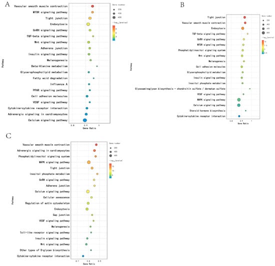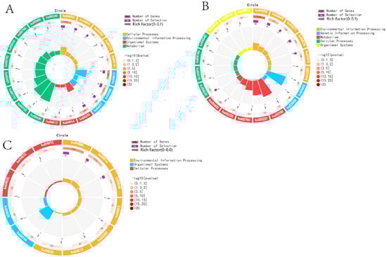 KEGG function analysis of DEMs in different reproductive periods: (A) KL vs. CL; (B) CL vs. XL; (C) KL vs. XL.