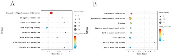 KEGG functional enrichment analysis of dynamic DEGs: (A) Profile 2; (B) Profile 5.