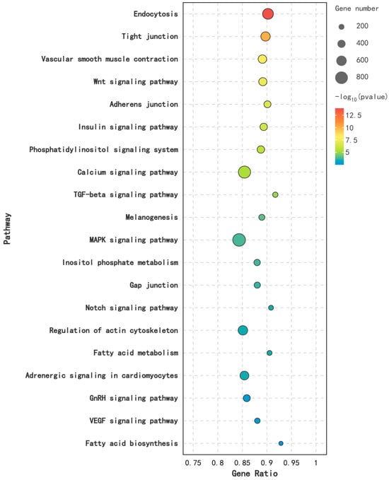 STEM analysis was also performed on DEMs in various breeding periods, identifying several key gene expression patterns. As shown in Figure 10, the module Profile5 was significantly expressed (p < 0.05). In this module, 58 miRNAs were up-regulated from the pre-laying period (KL) to the egg-laying period (CL) and down-regulated from the egg-laying period (CL) to the ceased-laying period (XL). Enrichment analysis of their target genes revealed 36 significantly enriched pathways (p < 0.05), including the Calcium signaling pathway, Endocytosis, the MAPK signaling pathway, the Wnt signaling pathway, and the GnRH signaling pathway (Figure 11).
