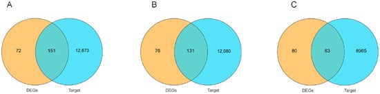 The intersection of differentially expressed genes and miRNA target genes at different reproductive stages Wayne diagram: (A) KL vs. CL; (B) CL vs. XL; (C) KL vs. XL.