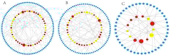 KL vs. CL miRNA–mRNA interaction network analysis diagram: (A) KL vs. CL; (B) CL vs. XL; (C) KL vs. XL. Red is up-regulated miRNA, yellow is down-regulated miRNA, and blue is mRNA.