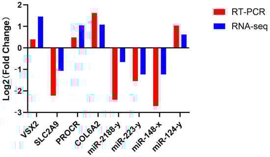 Oligo 7 and miRNA Design software(v1.01)) were used for primer design (S2), and the primers were synthesized by Shenggong Bioengineering Co., Ltd. (Shanghai, China). Four DEGs and five DEMs were randomly selected for RT-qPCR verification using GAPDH and U6 as internal reference genes for mRNA and miRNA, respectively. RT-qPCR was performed on mRNA using SYBR qPCR Master Mix (EZBioscience, MN, USA), and RT-qPCR was performed on miRNA using miRNA Universal SYBR qPCR-MasterMix (Vazyme, Nanjing, China). The relative gene expression level was calculated using the 2−ΔΔCt method. The reaction conditions of mRNA and miRNA qPCR were pre-denaturation at 95 °C for 5 min, then 40 cycles of 95 °C for 10 s and 60 °C for 30 s.