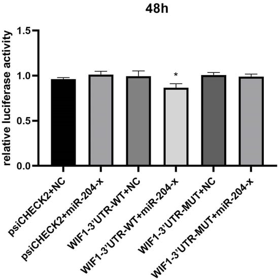 The dual luciferase activity ratio of miR-204-x and WIF1-3′UTR-WT co-transfection was significantly down-regulated compared with the control group (p < 0.05). The results showed that there was a target relationship between miR-204-x and WIF1-3′UTR-WT (Figure 16).