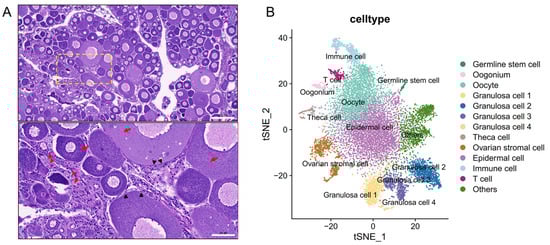 Cell types in the common carp ovary. (A) Observation of histological features of major cell types in the ovary using H&E staining. Scale bar = 200 µm (top), 50 µm (bottom); red arrows, oocyte; red arrowheads, oogonia; black arrowheads, granulosa cell. (B) Visualization of snRNA-seq data in t-SNE to reveal distinct cell clusters.