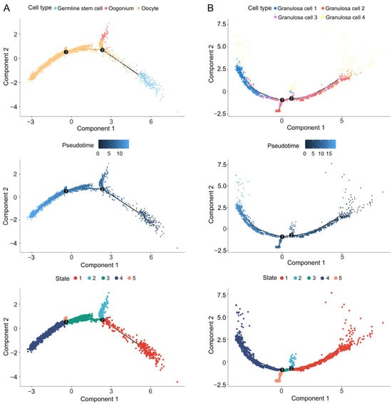 The pseudotime trajectory analyses. (A) Differentiation trajectories of germ cells. (B) Differentiation trajectories of granulosa cells. The numbers inside the black circles represent the branch points of different cell states; different colors in the top two figures represent different cell types; the colors from dark to light in the middle two figures represent the degree of differentiation; different colors in the bottom two figures represent different cell states.
