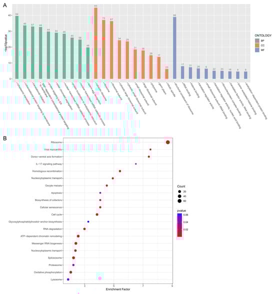 Functional annotation of dynamic expression genes in germ cells. (A) The bar plot of GO enrichment analysis of dynamic expression genes in germ cells. The number on the bar means gene numbers enriched in this term. BP, biological processes; CC, cell component; MF, molecular function. (B) The bubble diagram of KEGG enrichment analysis of dynamic expression genes in germ cells. The greater the enrichment factor, the more reliable the significance of differential gene enrichment in this pathway.