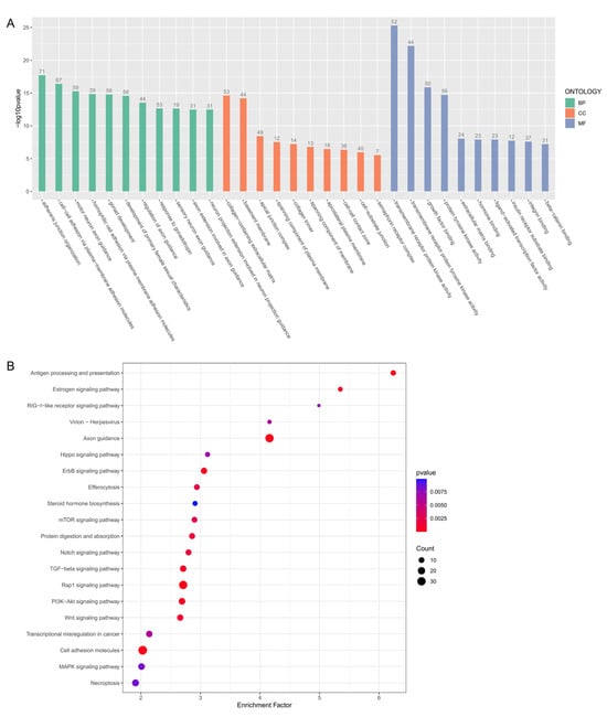 During the differentiation of granulosa cells, the GO analysis showed that dynamically expressed genes were involved in the response to gonadotropin, the development of primary female sexual characteristics, hormone binding, and the cell–cell contact zone (Figure 4A). The KEGG enrichment revealed that dynamic genes were related to the estrogen signaling pathway, steroid hormone biosynthesis, the TGF-β signaling pathway, and cell adhesion molecules (Figure 4B).