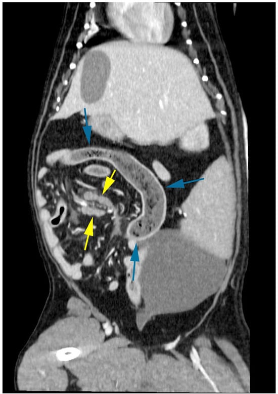 The dog was premedicated with a 5 ug/kg IV fentanyl bolus and anaesthesia induced with alfaxalone IV to effect. Anaesthesia was maintained with isoflurane and oxygen. Initial tachycardia was noted after induction, which resolved without medical intervention. Computed tomography (CT) was performed using a 16-slice helical scanner (GE Optima, Chicago, IL, USA) with a slice thickness of 1.25 mm, pitch of 0.938, rotation time of 0.8 s, 120 kVp, and 300 mAs. The patient was positioned in dorsal recumbency, and pre- and post-contrast (2 mL/kg IV iohexol) images of the thorax and abdomen were performed. All CT studies were submitted for review by a board-certified radiologist. There was a long (approximately 14 cm) moderately dilated segment of jejunum, which contained gas and mixed heterogeneous gas and soft tissue attenuating material (Figure 2, blue arrows). The caudal aspect was most significantly dilated, contained more gas, and tapered abruptly (Figure 3, red arrow). There was mild peritoneal effusion and fat stranding. The adjacent lymph nodes were moderately enlarged with an undulating outline and were hypoattenuating (Figure 3, yellow arrows). The stomach was mildly dilated with mixed material, the duodenum and pancreas were unremarkable, and there was a small amount of formed faecal material within the colon. There were no overt signs of an intestinal foreign body.