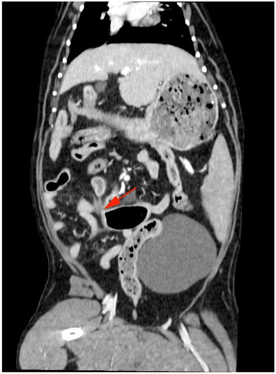 The typical presentation with strangulated intestine is consistent with an acute abdomen; however, clinical symptoms vary with the degree of vascular compromise and strangulation []. While microcirculatory changes within the intestines occur prior to clinical symptoms, the progression of symptoms and irreversible damage to the intestinal wall is often rapid []. Resection and anastomosis of non-viable intestines due to strangulation is common [,,,,]. In contrast, the dog in this report was stable and initially responsive to supportive treatment with fluids and analgesia. Initial diagnostics included three view abdominal radiographs, which were not conclusive of an obstructive pattern, with a maximal intestinal diameter to midbody fifth lumbar vertebrae ratio of <2.4 []. Abdominocentesis of scant-free abdominal fluid was not consistent with a septic abdomen. Hence, the clinicians continued with medical management for 72 h prior to surgical intervention. Computed tomography (CT) has been suggested to be more sensitive than radiographs for identifying mechanical intestinal obstruction [] and was diagnostic in this case (Figure 3, red arrow). Despite the prolonged duration of strangulation, the incarcerated region of the jejunum was subjectively viable at surgery, with evidence of active haemorrhage and peristalsis []. This is likely due to the rent in the ventral median ligament being relatively large and partially impeding vascular perfusion of the affected jejunal segment.