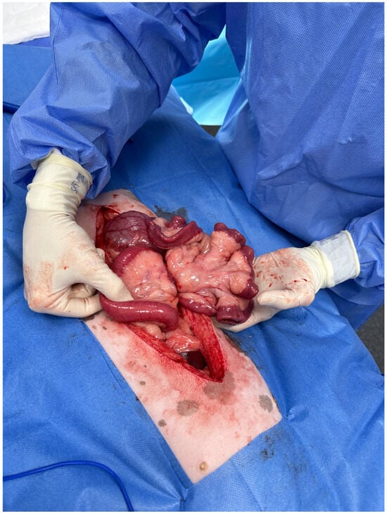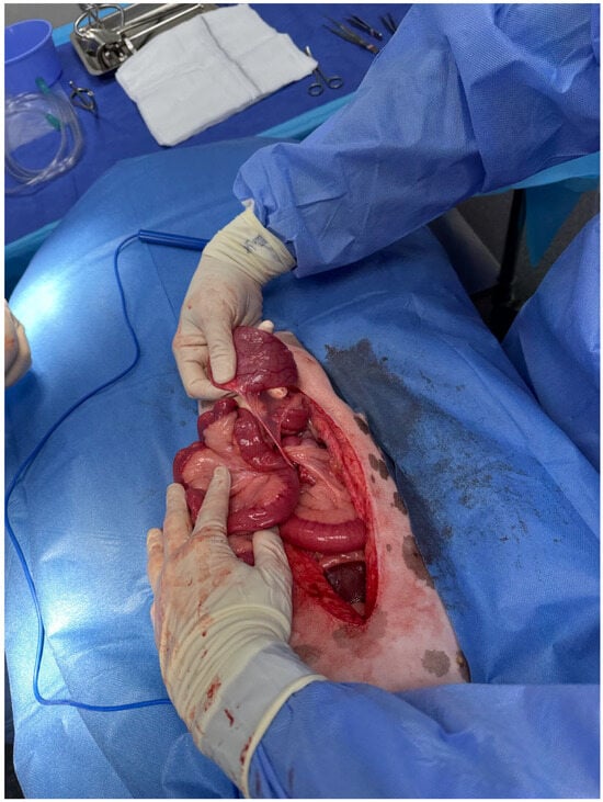 The imaging findings were suggestive of a mechanical intestinal obstruction. Differential diagnoses included previous surgical adhesions, strictures, or, less likely, intestinal torsion. Considering the imaging findings and the dog’s static clinical condition, it was elected to proceed with an exploratory laparotomy.