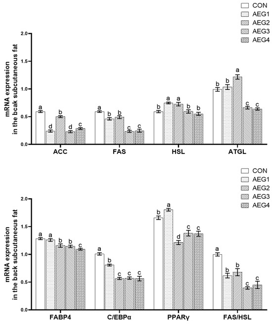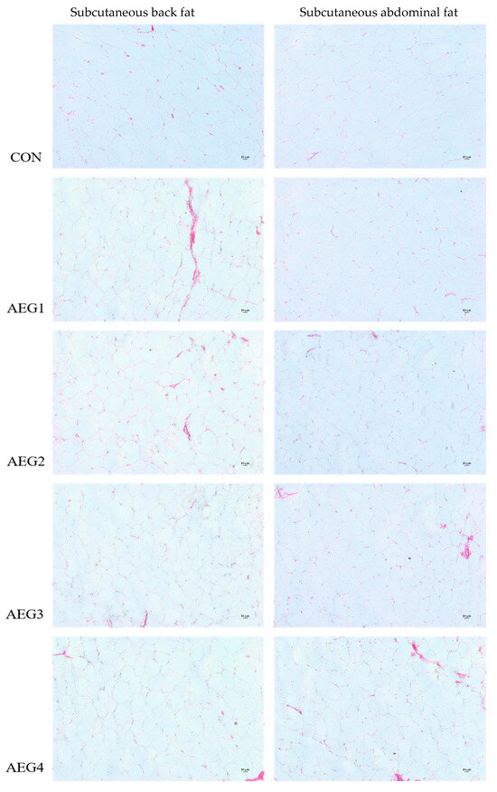 24]. This study discovered that the cell area size of subcutaneous back fat and subcutaneous abdominal fat was significantly lower than the CON group after feeding different proportions of acorn diets. Additionally, the number of cells increased in the unit field of view of microscope, indicating a reduction in the adipose deposition capacity in subcutaneous back fat and subcutaneous abdominal fat.