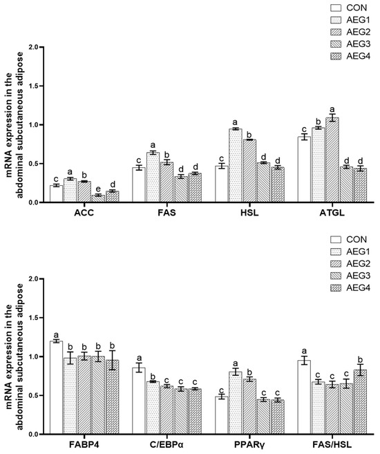 10]. The present study found that compared with the CON group, there were no significant differences in SFAs, MUFAs, and PUFAs of subcutaneous back fat and SFAs and MUFAs of subcutaneous abdominal fat in different groups. Inconsistent research results in the concentration of FAs might be due to the difference in the location of adipose tissue. We speculate that this may be caused by differences in the mechanisms involved in fatty acid synthesis and metabolism in different tissues. At present, there are few studies on the effect of acorns on fatty acid composition in subcutaneous fat, and the specific mechanism needs further study. We found that the NVI value of the abdominal subcutaneous adipose tissue in AEG2, AEG3, and AEG4 groups was significantly higher than that of the CON group, which suggested that feeding acorns may improve the nutritional value of the subcutaneous fat of Yuxi black pigs by increasing the NVI value.
