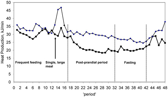 The 24 h HP of sows was affected by the different feeding frequencies in a similar manner for both of the feeding levels. When sows were consuming small meals every 30 min, HP was greater (p < 0.01) than when sows were fasting or following the large meal (post-prandial). The HP of the sows while eating, whether consuming the frequent, small meals or consuming the single large meal, was not different. A portion of the greater HP associated with eating is due to the physical activity of sows when consuming a meal. Sows tend to be quite enthusiastic about feeding and will consume their meals rapidly while standing. Furthermore, sows displayed physical activity the morning following the overnight ‘fasting’ period, assumingly awaiting their morning meal. The other portion of the greater HP associated with eating is due to the heat increment of feeding (HIF). Thus, greater HP is due, in part, to the EE associated with standing and consuming the meal and, on the other hand, due to the digestion of the consumed meal [30]. Increasing feeding frequency may improve the efficiency of protein metabolism because the delivery of amino acids is more gradual [31,32].