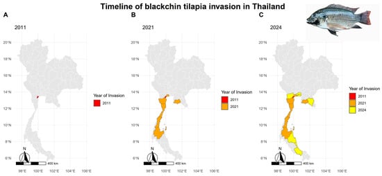 Timeline of blackchin tilapia (Sarotherodon melanotheron) invasion in Thailand. This figure illustrates the progressive invasion of blackchin tilapia across different provinces of Thailand from 2011 to 2024. Each map highlights the provinces invaded by blackchin tilapia by the indicated year, with consistent color coding to represent the invasion year (A) 2011—red; (B) 2021—orange; (C) 2024—yellow [21,23].