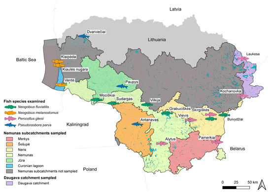 The River Nemunas has the largest catchment area in Lithuania, with 93% of Lithuanian territory being within or connected by canals to the Nemunas River basin. Of note is that the Nemunas River drainage basin is connected to the Pripyat, Vistula, and Berezina rivers by canals forming a northern branch of the central European invasion corridor [15,24]. Invasive fish species for parasitological assessment were sampled in both the Nemunas and Daugava river basins within the territory of Lithuania (Figure 1).