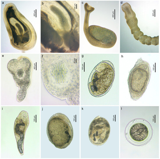 Microphotographs of the helminth parasites found in invasive fish in the present study: (a,b) Corynosoma semerme, live ex N. melanostomus (voucher, PQ570008, PQ557260); (c) Archigetes sieboldi, live ex N. melanostomus (voucher PQ570009); (d) Eubothrium crassum, live ex N. melanostomus (voucher, PQ570012); (e,f) Paradilepis scolecina, live ex N. melanostomus (voucher, PQ570010); (g) Bucephalus polymorphus, live, encysted ex N. fluviatilis (voucher, PQ582078, PQ560767); (h) B. polymorphus, live, encysted ex N. fluviatilis (voucher, PQ560768); (i) B. polymorphus, live, excysted ex N. fluviatilis (voucher, PQ560766); (j) Rhipidocotyle campanula, live ex Ps. parva (voucher, PQ560769); (k) Rhi. fennica, live ex Ps. parva (voucher, PQ560773); (l) Cyathocotyle prussica ex N. melanostomus (voucher, PQ560792).