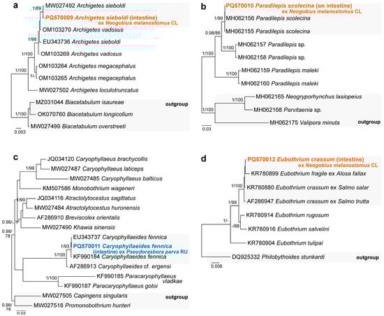 Phylograms resulting from Bayesian inference (BI) analyses based on the 28S rDNA sequences of (a) Archigetes spp., (b) Paradilepis spp., (c) representatives of the Lytocestidae, and (d) Eubothrium spp. with nodal support values shown at the node as BI/ML (maximum likelihood). Only values > 0.90 (BI) and >70 (ML) are displayed. Scale bar indicates the expected number of substitutions per site. Sequences generated in this study are in bold and the colour corresponds to the colour of their fish host (see Figure 1, Table 1 for abbreviations).