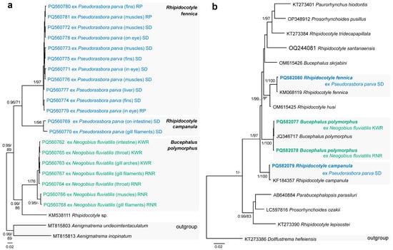 Two other members of this family, Rhipidocotyle campanula (Dujardin, 1845) (Figure 2j) and Rhi. fennica Gibson, Taskinen & Valtonen, 1992 (Figure 2k) were found in Ps. parva. Metacercariae of Rhi. campanula were found on the intestine and gills filaments in fish collected from a swamp near Dvarviečiai (P = 6%, 1–2) and metacercariae of Rhi. fennica were found in different host tissues (in the eyes, intestinal wall, liver, muscles, and fins) in fish from a swamp near Dvarviečiai (P = 82%, 1–76) and the River Pilvė (P = 82%, 1–73). Species delimitation and identification of both species of Rhipidocotyle (Figure 2j,k) was based on the 28S rDNA and cox1 sequence analyses (Figure 4). Our study is the first to report both species parasitising Ps. parva.