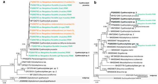 Phylograms resulting from Bayesian inference (BI) analysis based on the (a) cox1 mtDNA and (b) 28S rDNA sequences of the members of the Cyathocotylidae with nodal support values shown at the node as BI/ML (maximum likelihood). Only values > 0.90 (BI) and >70 (ML) are displayed. Scale bar indicates the expected number of substitutions per site. Sequences generated in this study are in bold and the colour corresponds to the colour of their fish host (see Figure 1, Table 1 for abbreviations).