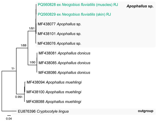 A single member of the family Heterophyidae, the unidentified species Apophallus sp., was found in N. fluviatilis from the Kaunas Water Reservoir (P = 3%, 3), as well as from the Jūra (P = 11%, 1–48) and Nemunas (Vilkija, P = 3%, 1) rivers. This species was identified based on the cox1 mtDNA sequence analyses (Figure 8). The representatives of the genus Apophallus parasitise birds and mammals [61].