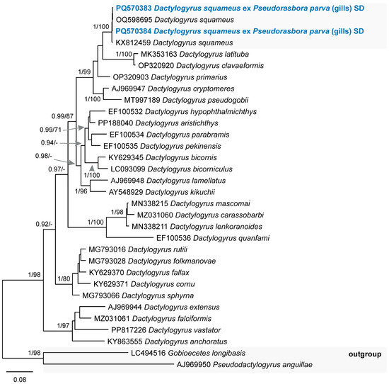 Phylogram resulting from Bayesian inference (BI) analysis based on the 28S rDNA sequences of the members of Dactylogyrus with nodal support values shown at the node as BI/ML (maximum likelihood). Only values > 0.90 (BI) and >70 (ML) are displayed. Scale bar indicates the expected number of substitutions per site. Sequences generated in this study are in bold and the colour corresponds to the colour of their fish host (see Figure 1, Table 1 for abbreviations).