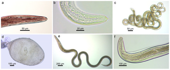 Another species found in monkey gobies from the Nemunas (Vilkija, P = 3%, 2) and Neris (Buivydžiai, P = 7%, 3) rivers was Rhabdochona sp. (Rhabdochonidae). Nematodes of Raphidascaris acus (Bloch, 1779) (Raphidascarididae) (Figure 12d–f) were found in both N. fluviatilis from the Jūra (P = 6%, 3), Nemunas (Vilkija, P = 21%, 1–4) and Neris (Skirgiškės, P = 7%, 1) rivers, and N. melanostomus from the Curonian Lagoon (Kiaulės nugara, P = 1 out of 7, 1). This species of nematode is common in both gobiid species in their native distribution ranges as well as in their non-native ranges in waterbodies in Austria, Croatia, Czechia, Germany, Hungary, France, Slovakia, Ukraine, and the USA [51]. In Europe, Ra. acus uses pike Esox lucius Linnaeus, 1758 as its main host; adult worms are also found in fish from the Anguillidae, Lotidae, Percidae, and Salmonidae, and occurrence in other fishes is rare [65]. Larvae of Ra. acus were found in various fish species of different families [65]. The only species of nematode found in Ps. parva from the River Pilvė (P = 27%, 2–6) and a swamp near Dvarviečiai (P =24%, 1–4) was Pse. tomentosa (Capillariidae) (Figure 12c). This nematode is distributed widely in Palearctic Eurasia and North America, has a direct life cycle and a wide variety of freshwater fish can serve as its definitive hosts [64].