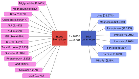 Key findings of our study included strong positive relationships between lactation stages and blood biomarkers like glucose and cholesterol, as well as milk protein levels. Blood biomarkers such as triglycerides, magnesium, and urea showed significant correlations with various milk parameters. Canonical correlation analysis identified strong relationships between blood biomarkers and milk composition, with blood triglycerides and milk urea being the most influential variables. The presented findings suggest that understanding these correlations can help improve dairy cow management and milk production strategies.