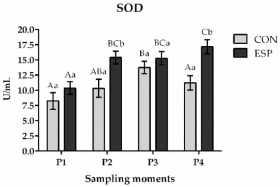 The ESP group had significantly higher SOD activity (Figure 1) compared to the CON group in the P2 and P4 moments (p < 0.01) while there were no significant differences in the P1 and P3 moments (p > 0.05). Our results revealed an increasing trend of SOD activity in the ESP group being higher in each sampling moment compared to the previous one (p < 0.05), while in the CON group, SOD activity was significantly lower in the P4 moment compared to the P3 moment (p < 0.05).