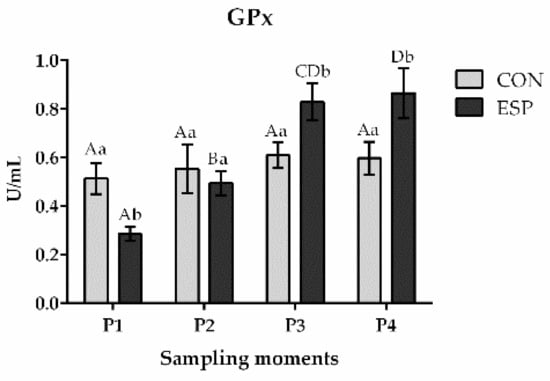 Effects of Espermaplus supplementation on glutathione peroxidase (GPx) activity in sperm plasma. CON—control group; ESP—group supplemented with Espermaplus. P1—the day when Espermaplus supplementation started; P2—the day after three-week period of Espermaplus supplementation; P3—the day after the eight-week period of Espermaplus supplementation; P4—the day after the twelve-week period of Espermaplus supplementation. Different lowercase letters indicate statistically significant differences within the same group at different moments; Different uppercase letters indicate statistically significant differences between groups at the same sampling moment.