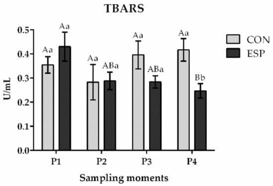 Effects of Espermaplus supplementation on thiobarbituric reactive substance (TBARS) concentration in sperm plasma. CON—control group; ESP—group supplemented with Espermaplus. P1—the day when Espermaplus supplementation started; P2—the day after three-week period of Espermaplus supplementation; P3—the day after the eight-week period of Espermaplus supplementation; P4—the day after the twelve-week period of Espermaplus supplementation. Different lowercase letters indicate statistically significant differences within the same group at different moments; Different uppercase letters indicate statistically significant differences between groups at the same sampling moment.