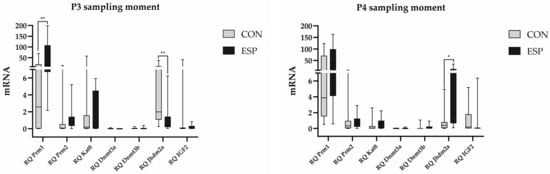 Epigenetic-related gene expression levels at the P3 moment (the day after the eight-week period of Espermaplus supplementation) and P4 moment (the day after the twelve-week period of Espermaplus supplementation) in the control (CON) and Espermaplus-supplemented (ESP) groups of boars. *—p < 0.05, **—p < 0.01.
