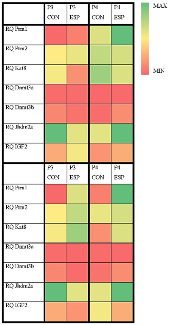 Heath map of median values for the relative gene expression levels (Prm1, Prm2, Kat8, Dnmt3a, Dnmt3b, Jhdm2a, IGF2) at different moments (P3 and P4) in the ESP and CON groups. CON—control group; ESP—Espermaplus-supplemented group; P3—the day after the eight-week period of Espermaplus supplementation; P4—the day after the twelve-week period of Espermaplus supplementation.