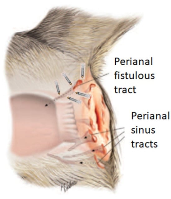 Prior to the ASC administration procedure, the general anaesthesia of the patient was induced by intravenous neuroleptoanalgesia using a combination of xylazine/ketamine (1 mg/kg/10 mg/kg, Ket-A-Xyl®, Agrovet Market, Animal Health, Lima, Peru). Subsequently, the syringes with the cells were removed from refrigeration and kept at room temperature in the operating room of the veterinary clinic, until administration in doses of 1 × 106 diluted in PBS at each point of each fistula, as indicated in Figure 1, using a 1 mL syringe with a No. 25 G × 5/8″ needle. Since the origin of a fistula is the internal orifice, it was considered that efficacy would be greater if the cells were injected into the tissue surrounding the fistula orifice and along the walls of the fistulous tracts; care was taken not to deposit the cells in the lumen of the orifice, similar to previous work in humans [20]. In no case was the fistula sutured and neither topical nor systemic antibiotics were applied. A second and third dose was applied in two patients (Table 1. Patient number 4 and 10) when there was evidence of recurrence of the clinical picture expressed by pruritus in the perianal area, but no fistula was present. A dose of 5 × 106 cells was applied to the erythematous area.