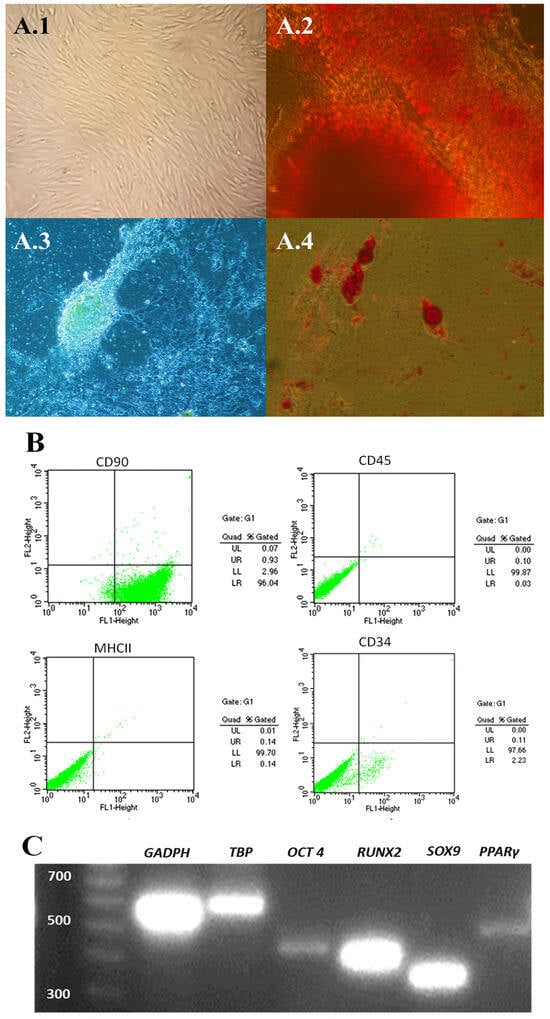 Characterisation and differentiation of canine adipose-derived mesenchymal stem cells (ASCs). (A) Differentiation of ASCs (A.1) into osteogenic (A.2), chondrogenic (A.3) and adipogenic (A.4) lineages. Cells were stained with von Kossa stain for osteogenic lineage (2), Alcian blue stain for chondrogenic lineage (3) and oil red O stain for adipogenic lineage (4). (B). Phenotypic characterisation of ASCs by flow cytometry. Results positive for CD90 and negative for CD34, CD45 and MHCII. (C). Expression of pluripotency markers in ASCs. The expression genes were OCT-4, RUNX2, SOX9, and PPARγ, while GAPDH and TBP were used as housekeeping genes.