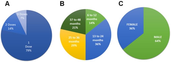 Representation of the study population with regard to the number of doses (A); months after treatment (B); and sex (C). n = 14.